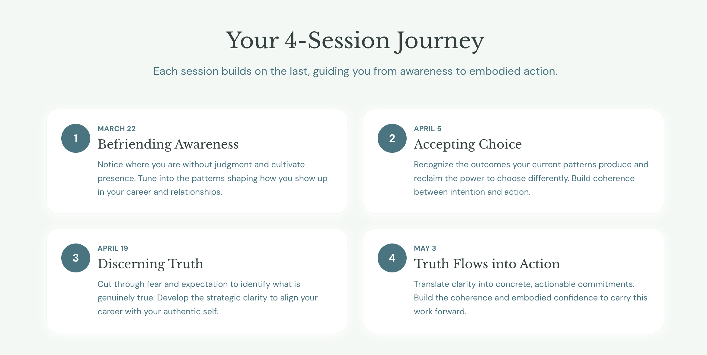 You translate clarity into concrete, committed action. You build the embodied confidence to carry this work forward when the program ends and the river keeps moving.