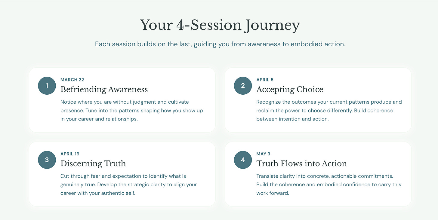 You cut through the noise of fear, other people’s expectations, and stories you inherited from circumstances that no longer apply. You identify what is genuinely true. Then you build the strategic clarity to align your career with your authentic self. That phrase sounds like a bumper sticker until you do the work, at which point it sounds like something you should have done three years ago.
