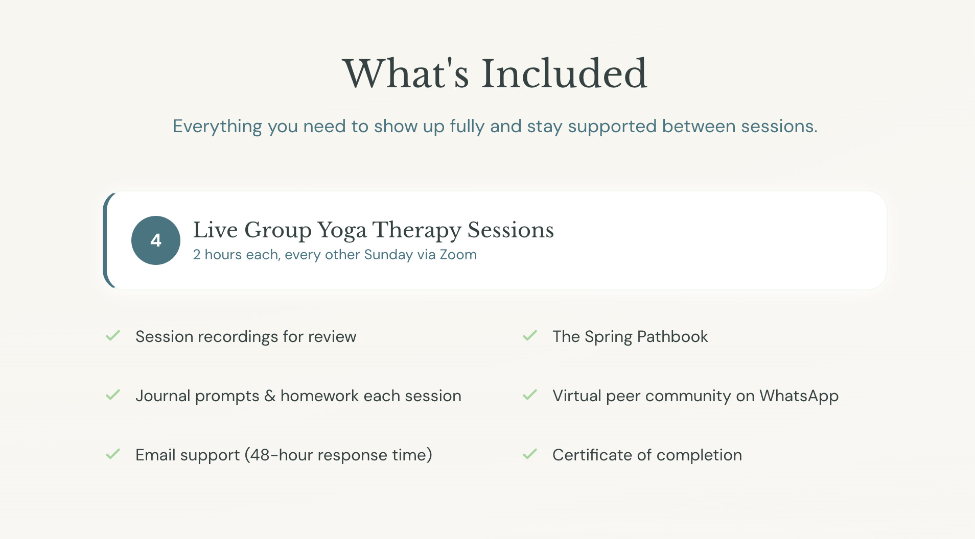 Four live group yoga therapy sessions, two hours each, via Zoom, with recordings available after each one. The Spring Pathbook with journal prompts and homework for every session. A virtual peer community. Email support with a 48-hour response time. And a certificate of completion.